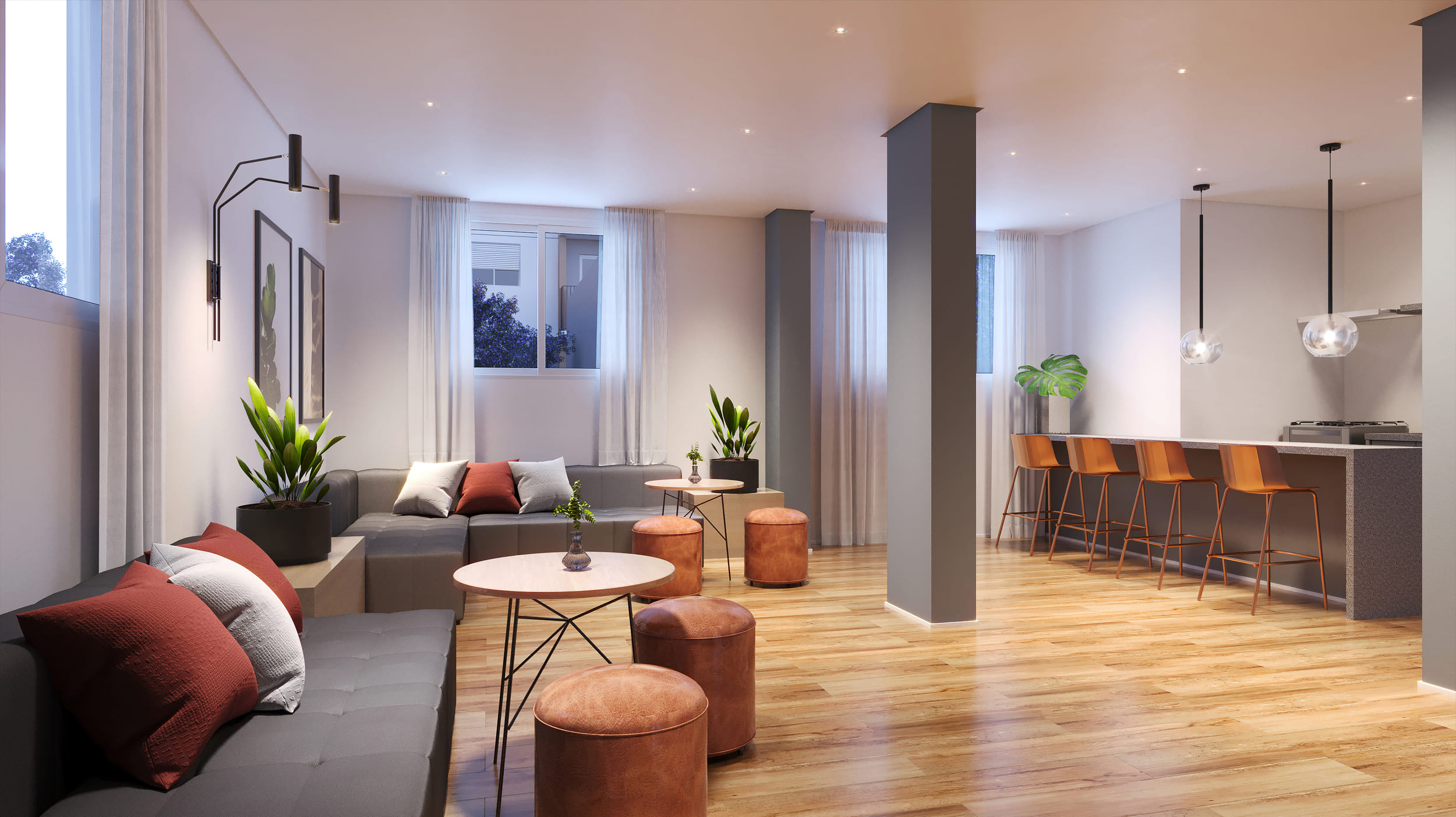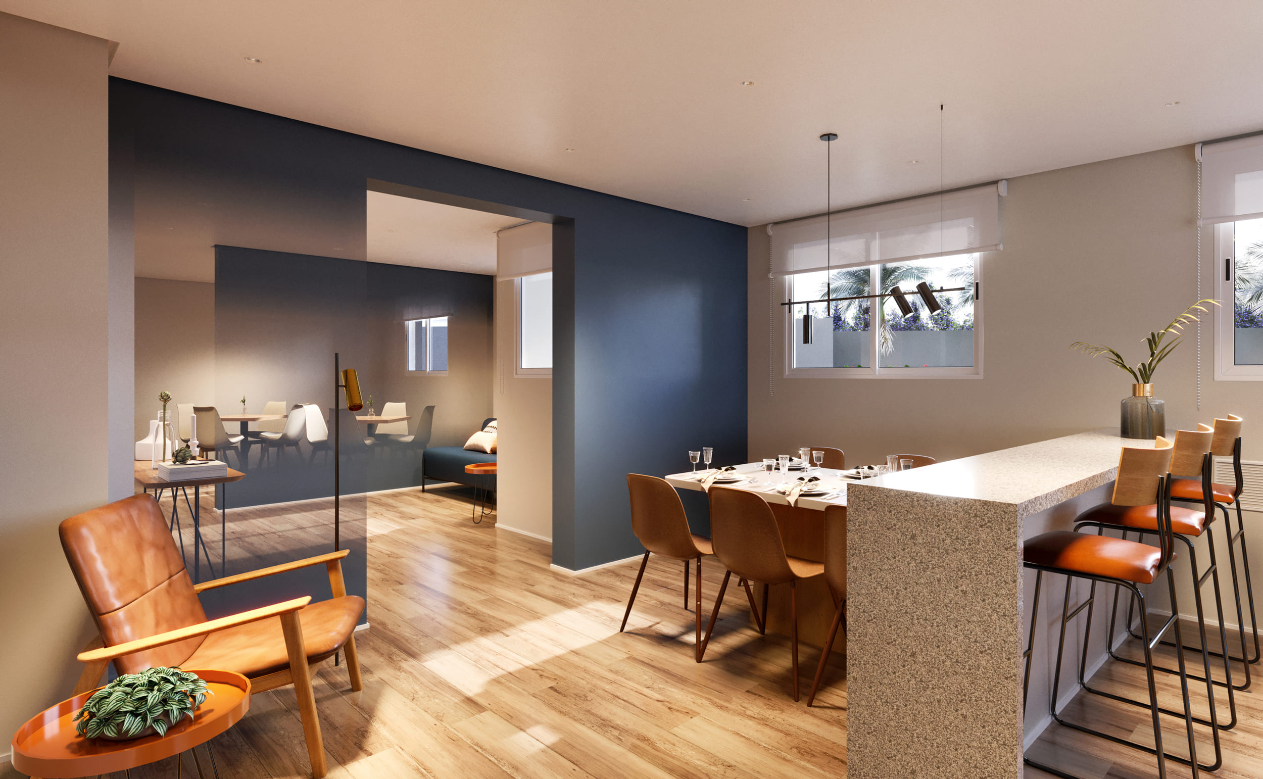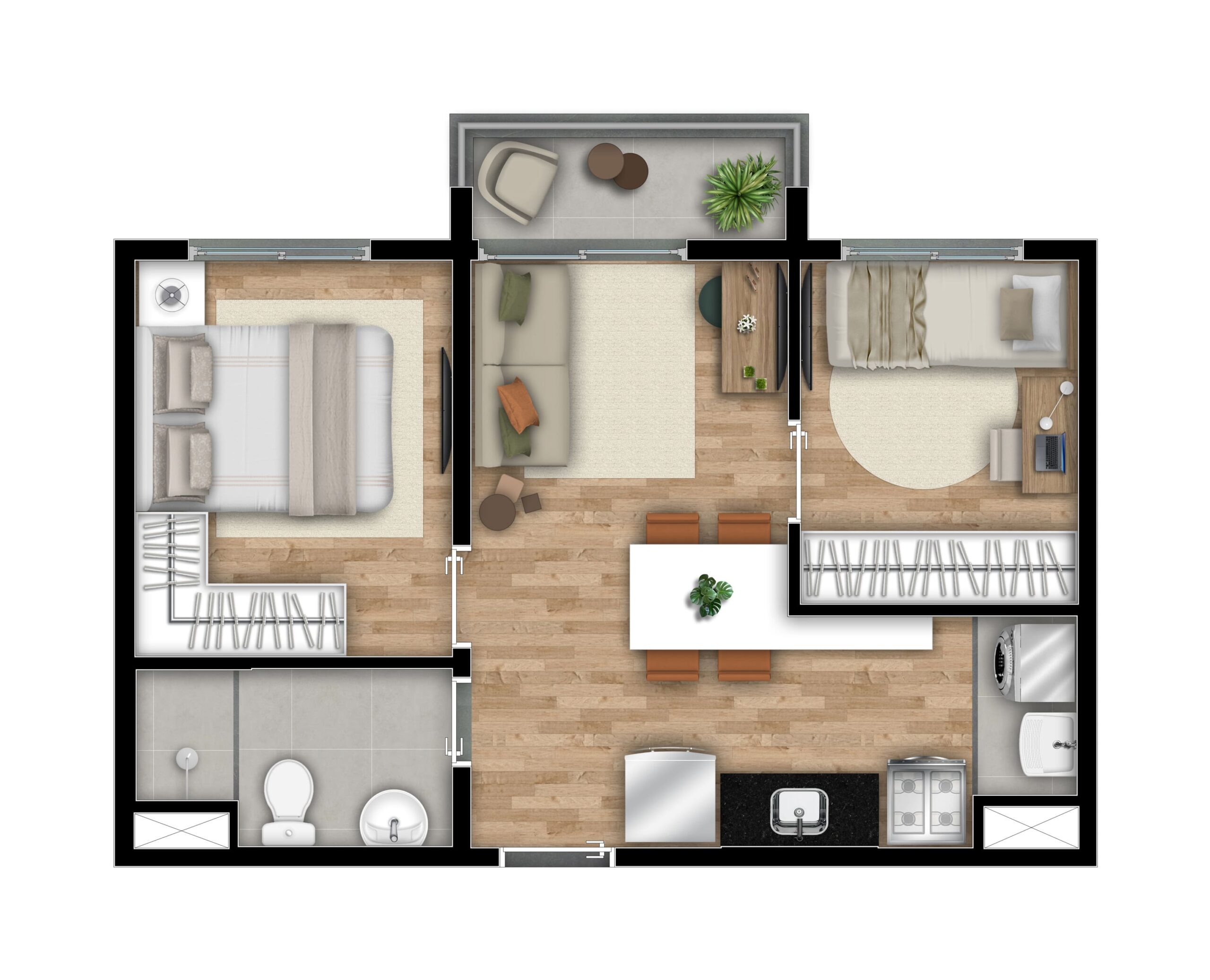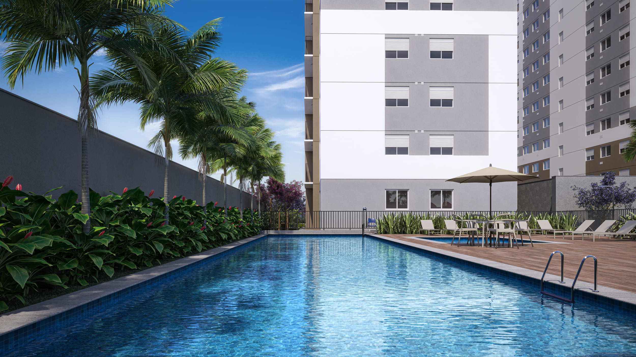 São 697 apartamentos distribuídos em 3 torres, com opções de estúdios e 2 dormitórios em metragens que vão de 24 m² a 40 m². As plantas são compactas e bem resolvidas, com cozinha integrada ao living, área de serviço, banheiro com ventilação mecânica, piso laminado nos dormitórios e persianas de enrolar. Ideal para quem quer sair do aluguel ou investir em uma região valorizada.