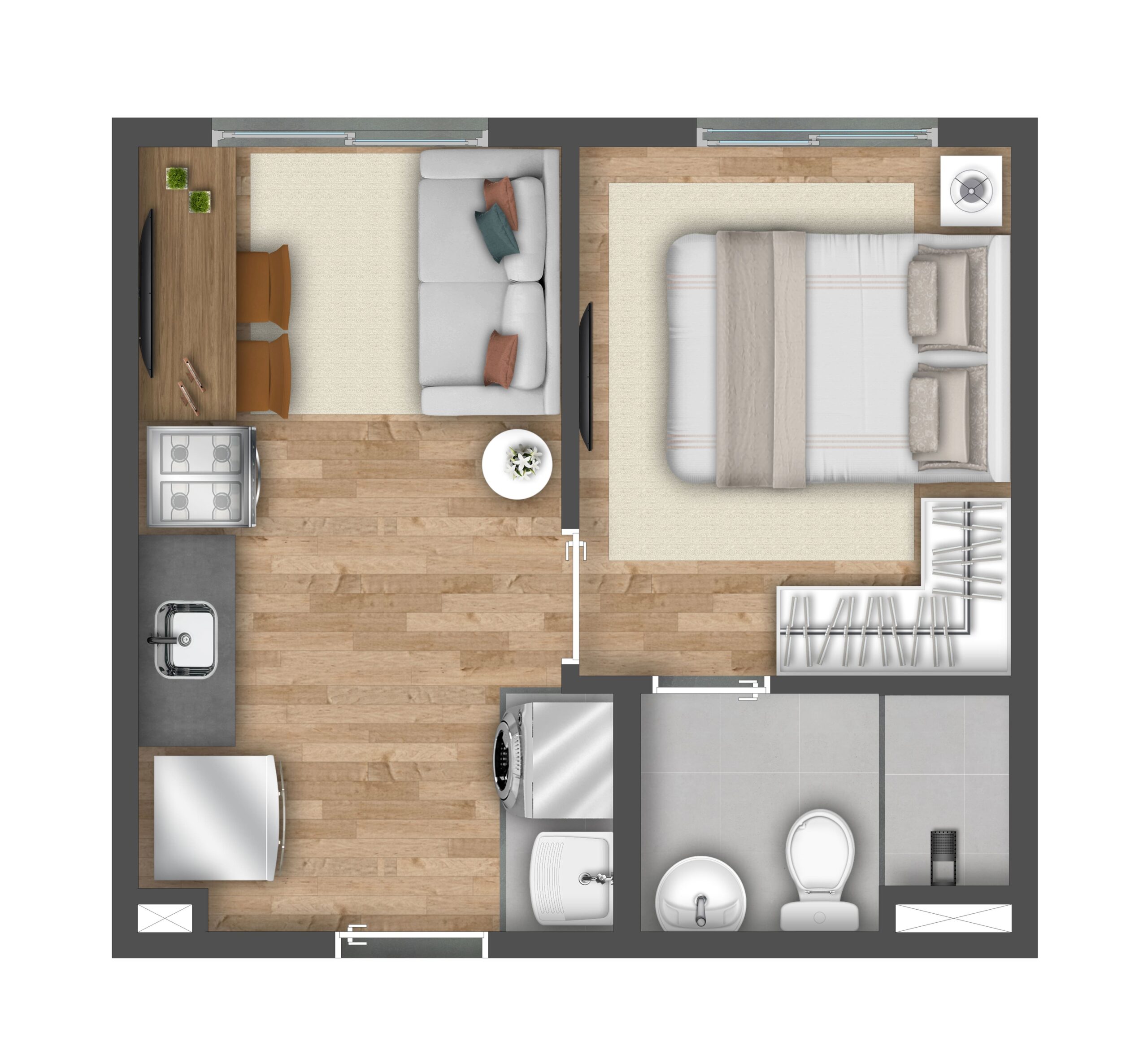 🟠 Plantas de 24 a 40 m² com estúdios e 2 dorms bem distribuídos