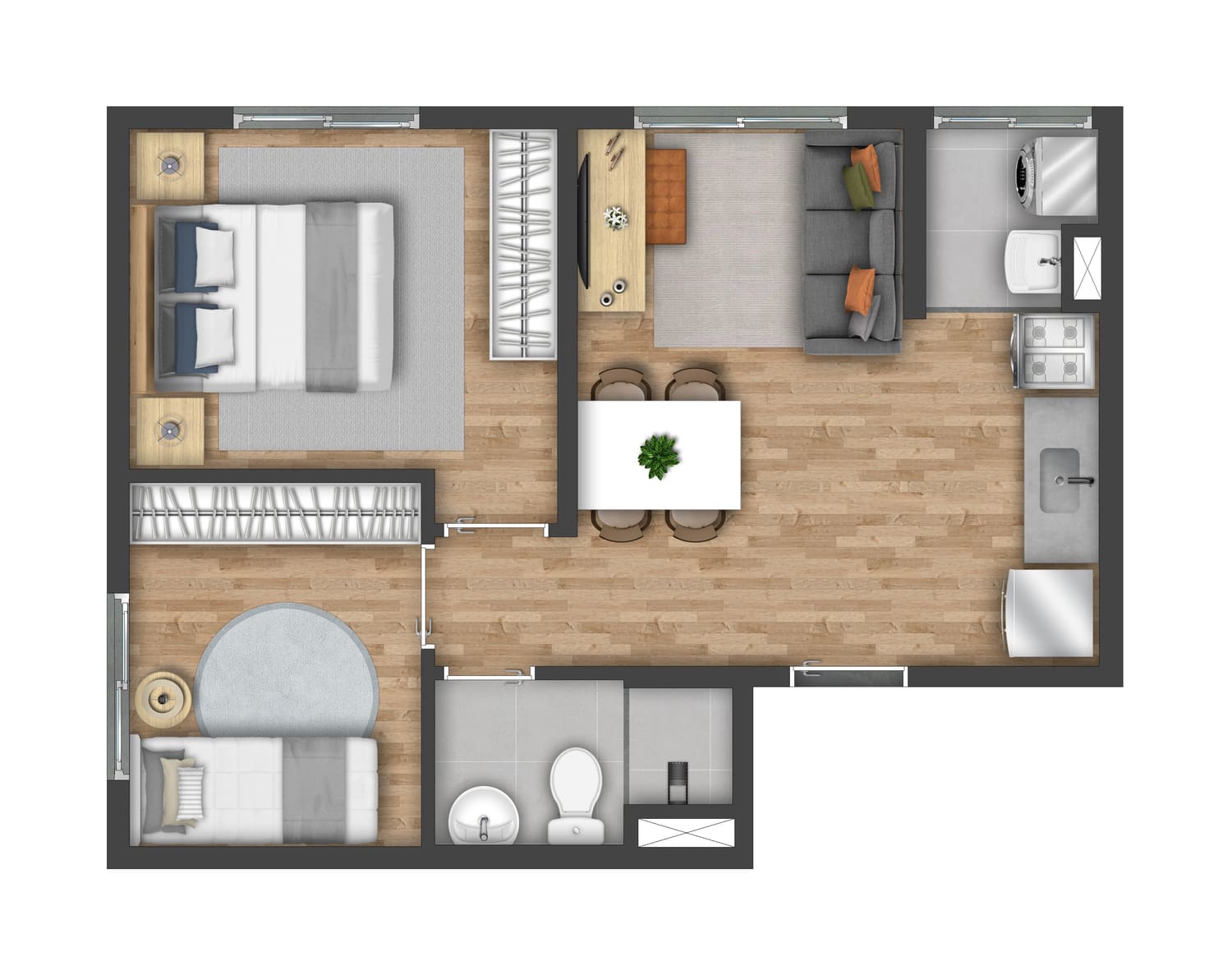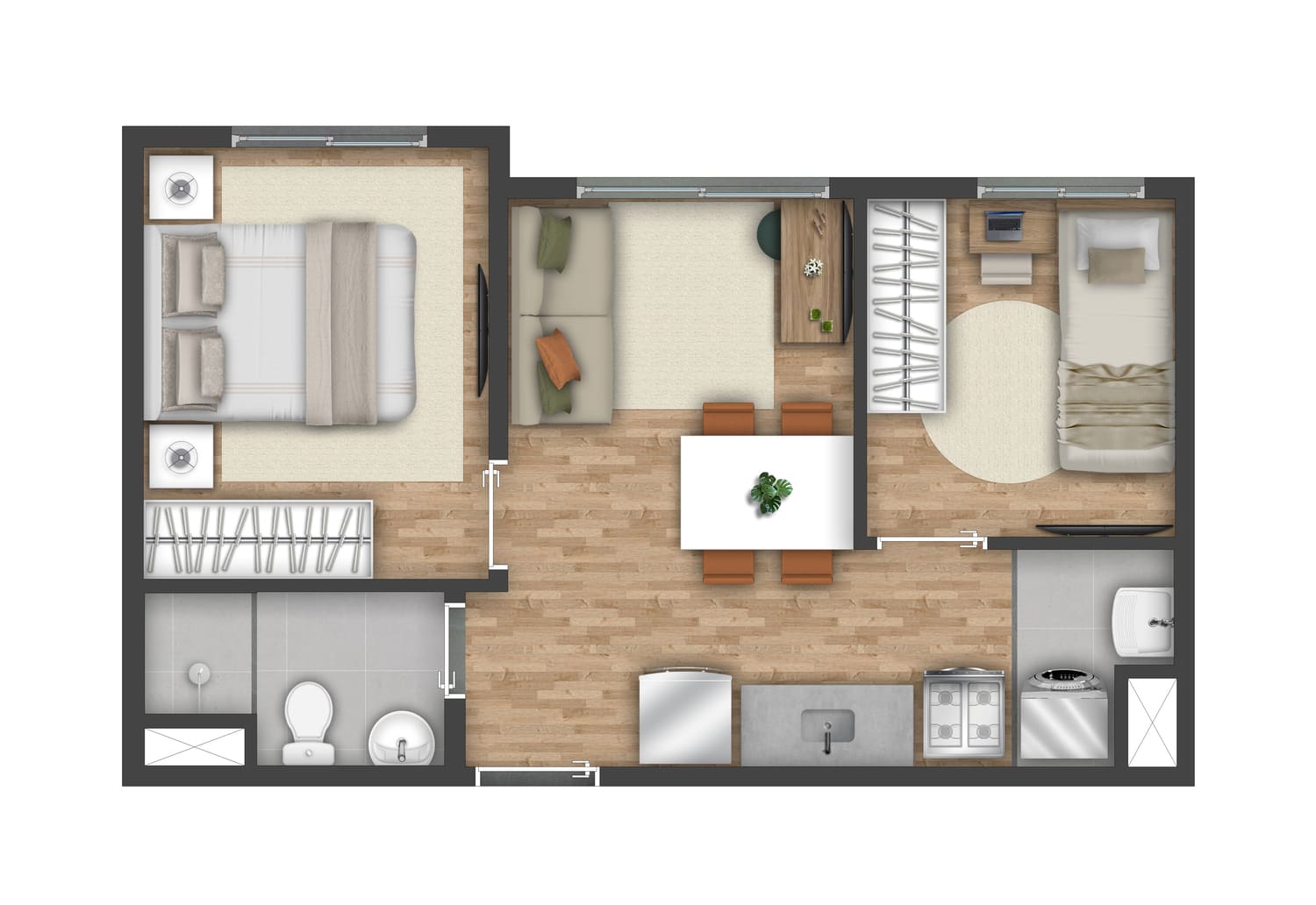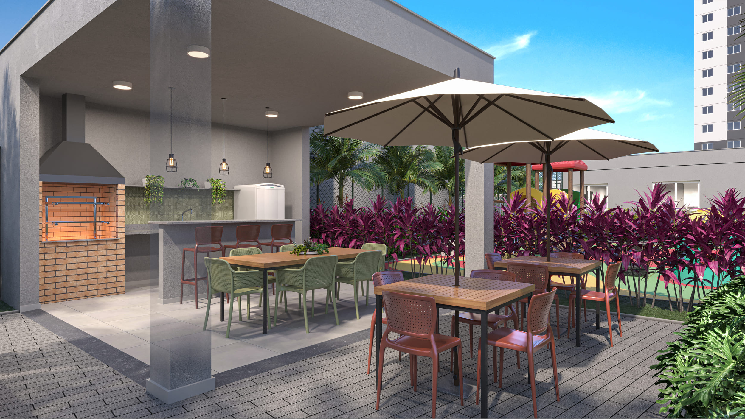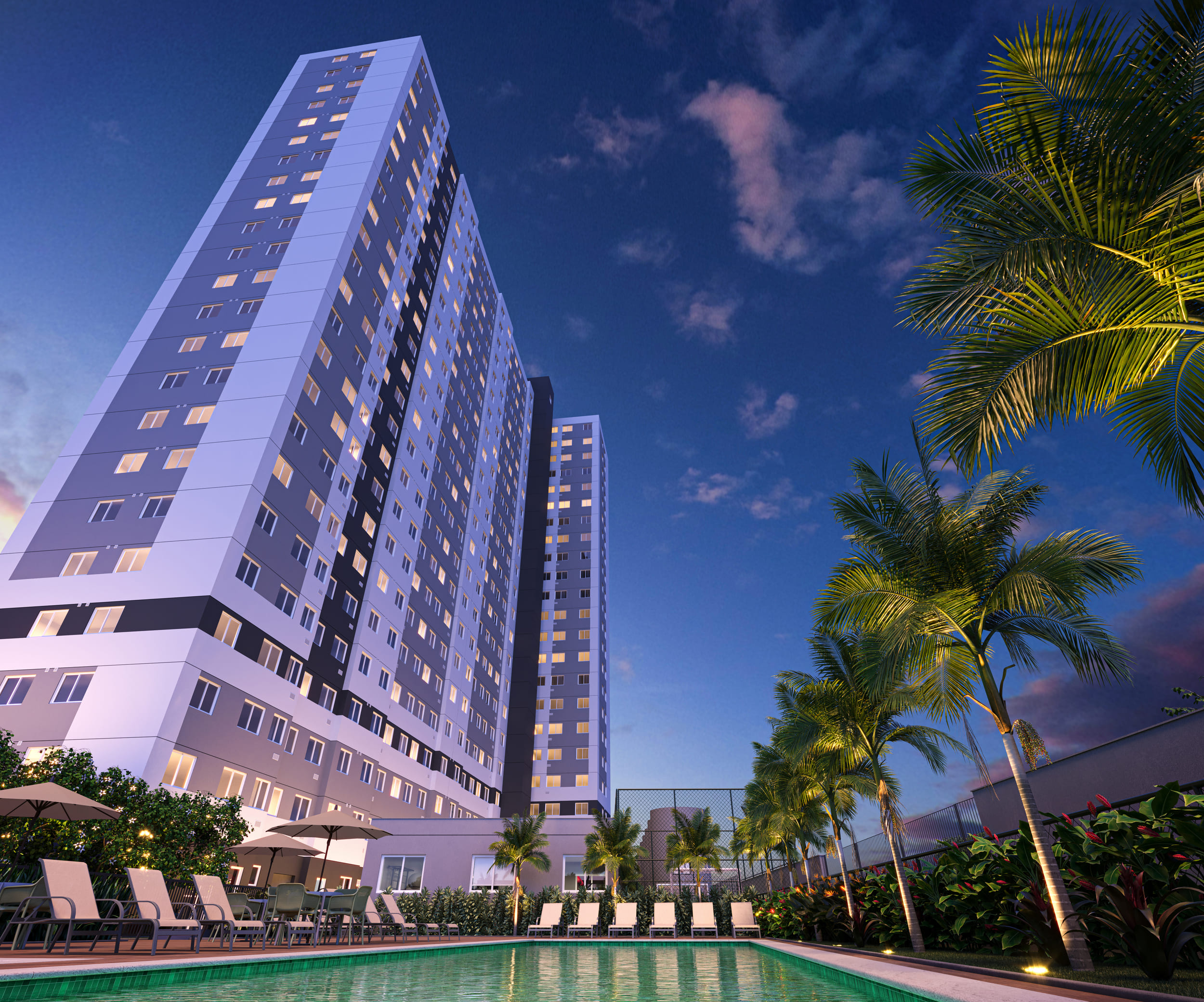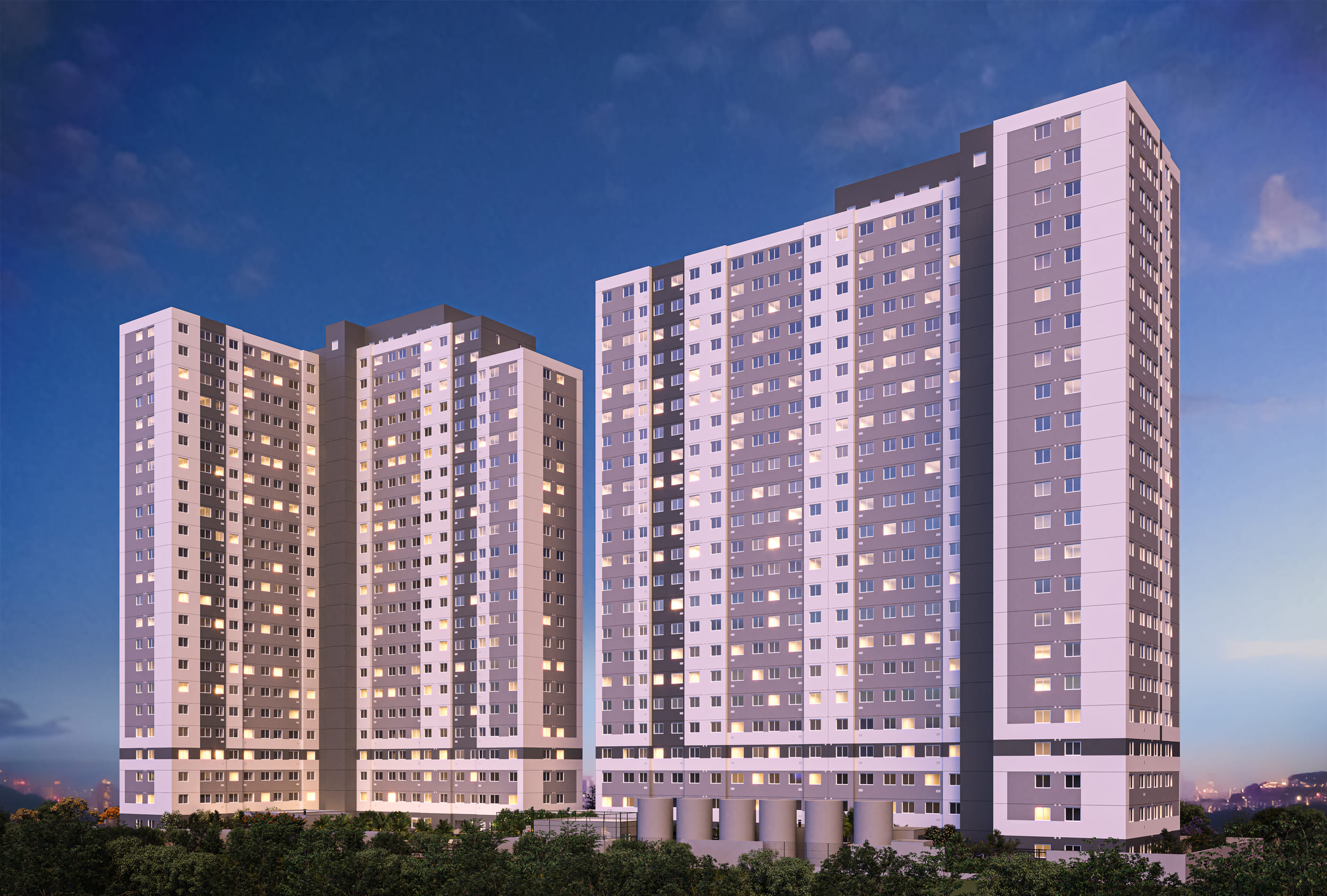 São 2 torres com até 22 pavimentos e um total de 763 unidades residenciais, com opções de 1 e 2 dormitórios e metragens que variam de 31 a 37 m². As plantas foram pensadas para o dia a dia, com cozinha integrada, ponto para máquina lava e seca, área de serviço com ventilação natural em algumas tipologias e medição individualizada de água.