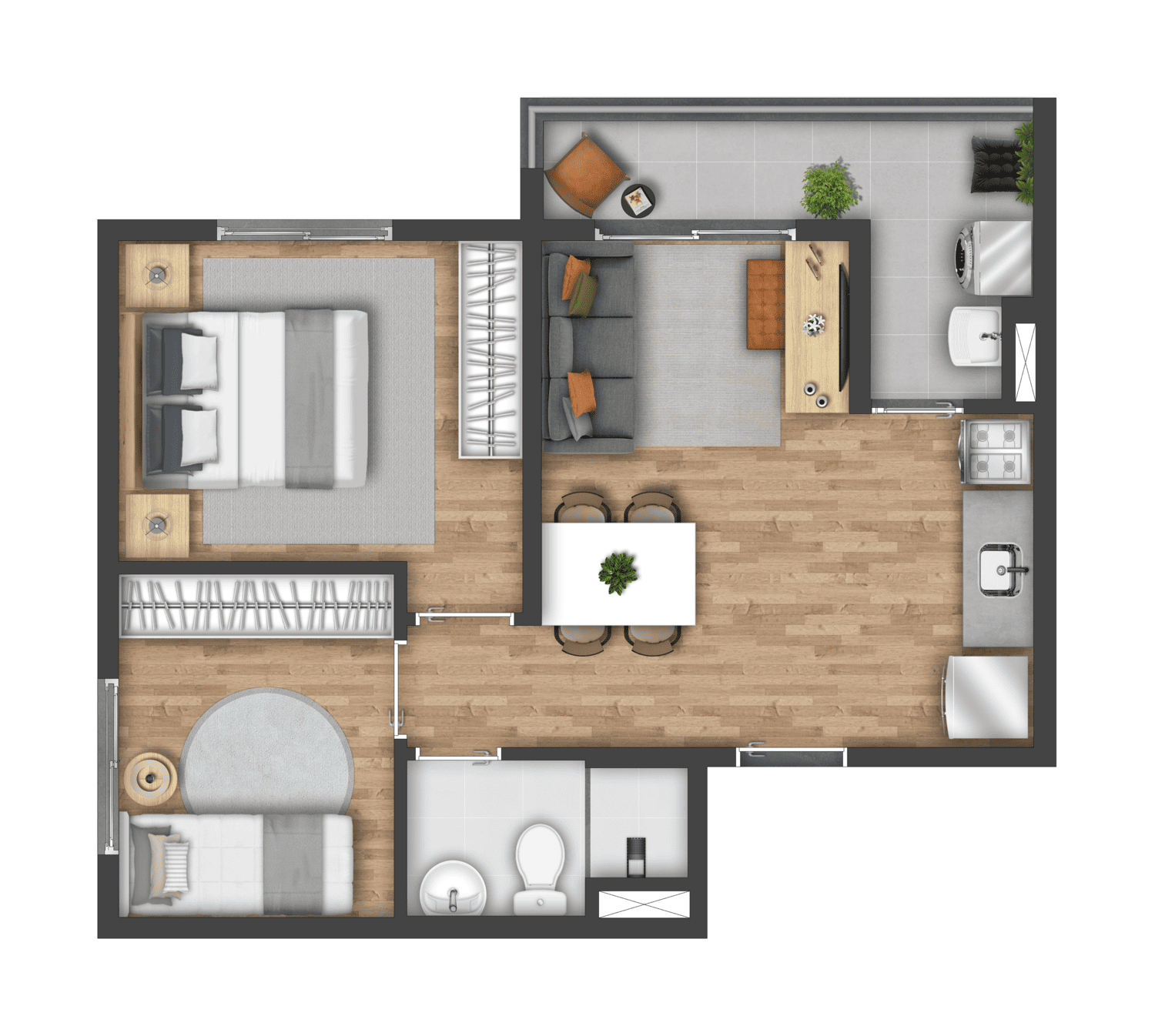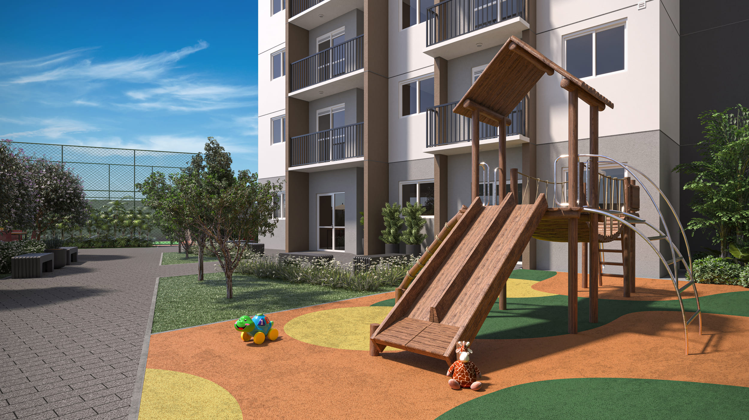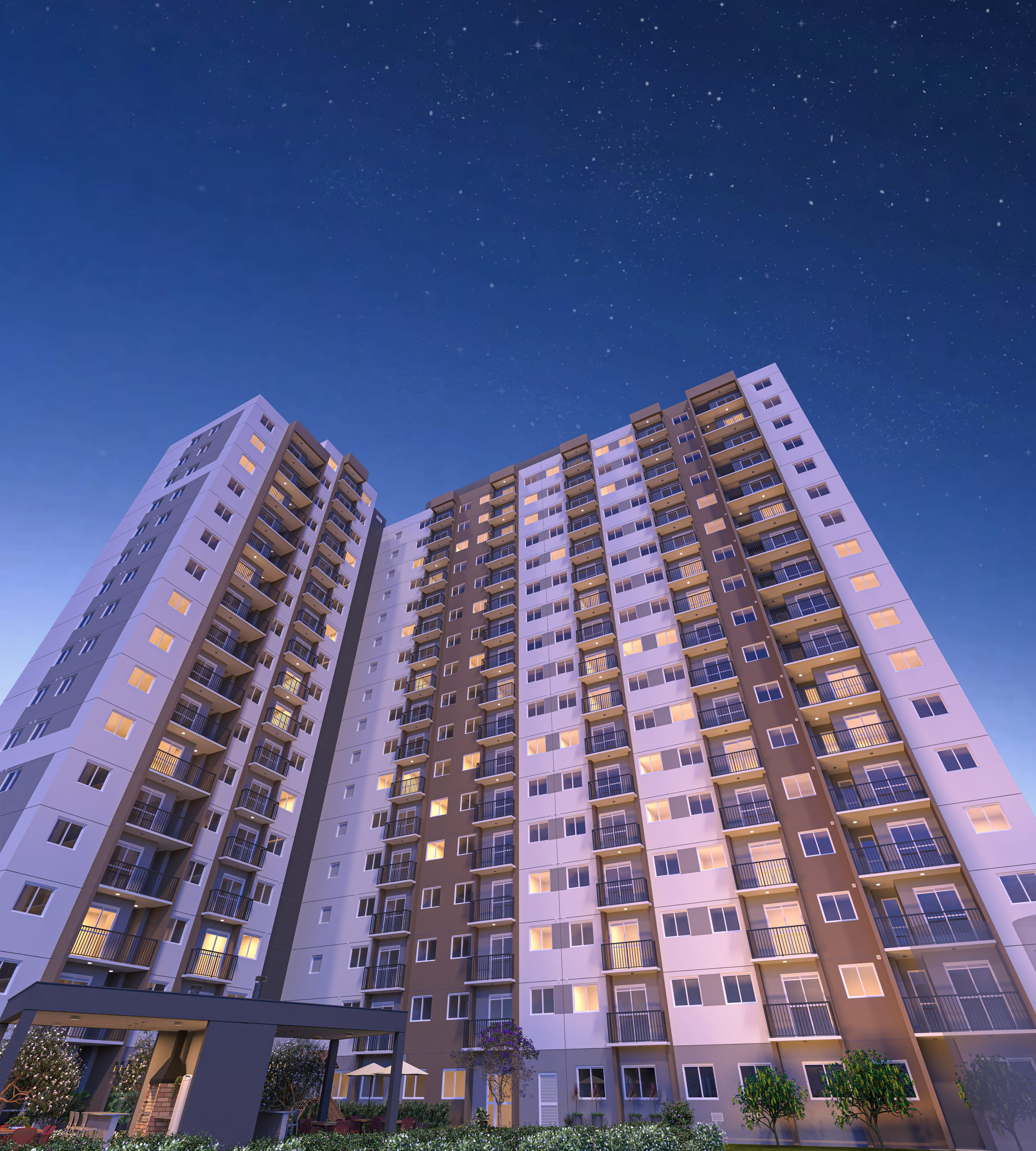 Com uma torre única e 257 apartamentos, o projeto oferece opções de 2 dormitórios, com metragens de 36 a 40 m², além de unidades garden com metragem ampliada. As plantas são inteligentes, com cozinha integrada, área de serviço ventilada e ambientes pensados para um dia a dia funcional.